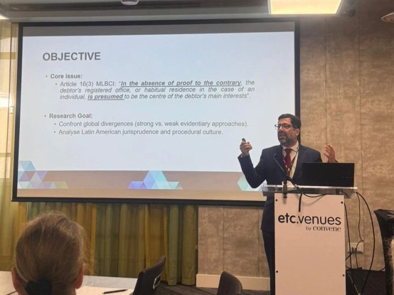 El académico abordó las variables relativas a la discusión internacional sobre la presunción del centro de intereses principales del deudor (COMI), eje del artículo 16(3) de la Ley Modelo de la Comisión de Naciones Unidas para el Derecho Mercantil Internacional (CNUDMI o UNCITRAL, por sus siglas en inglés).